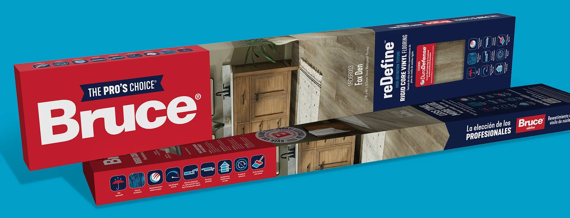 AHF Products partnered with WFM to develop packaging, creative, and messaging to help Bruce, an iconic American flooring brand known for quality hardwood, redefine LVT flooring to bring high performance flooring to every room in the home. While capitalizing on established brand recognition, WFM expanded Bruce’s existing icon system, bringing it to the forefront to better educate consumers on the benefits of installing Bruce reDefine flooring. WFM highlighted the innovative scratch and abrasion resistance technology unique to the product through name generation (DuroDefense) and logo development. Finally, to further emphasize the product’s positioning as the “Less time. More value” flooring option, WFM created an enhanced feature/benefits cross section illustrating how each layer of flooring material delivers on durability, value and ease of installation.